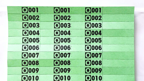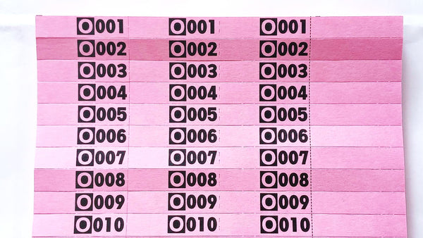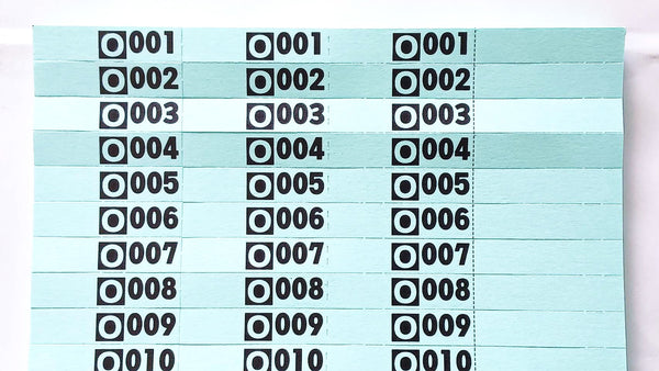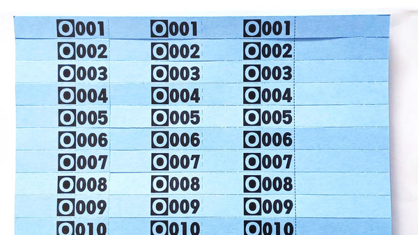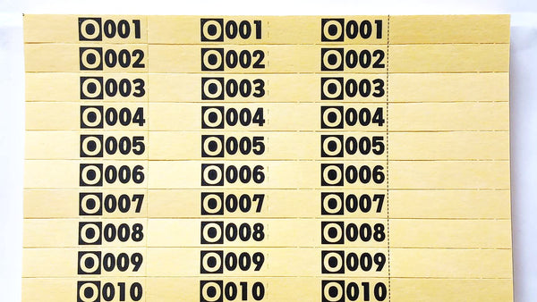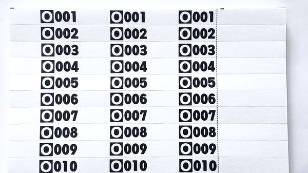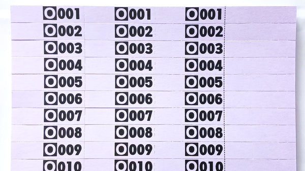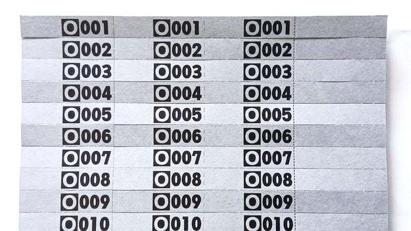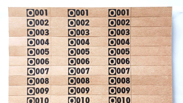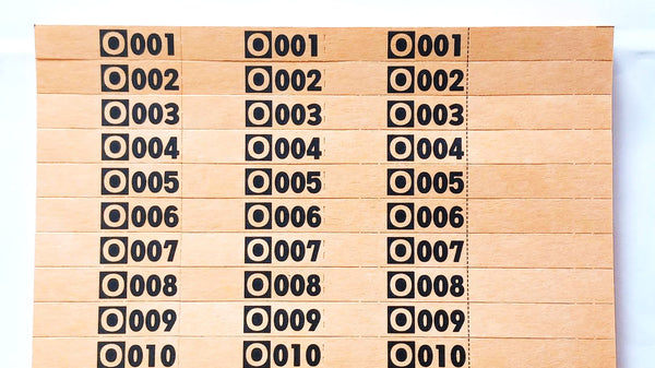 控が2つ付いた1万点連続番号が入ったタックです。一番左の控は洗う前に簡単に切り取れ、真ん中の控は本タックに付けたまま洗えるよう切れにくいミシン目になっています。